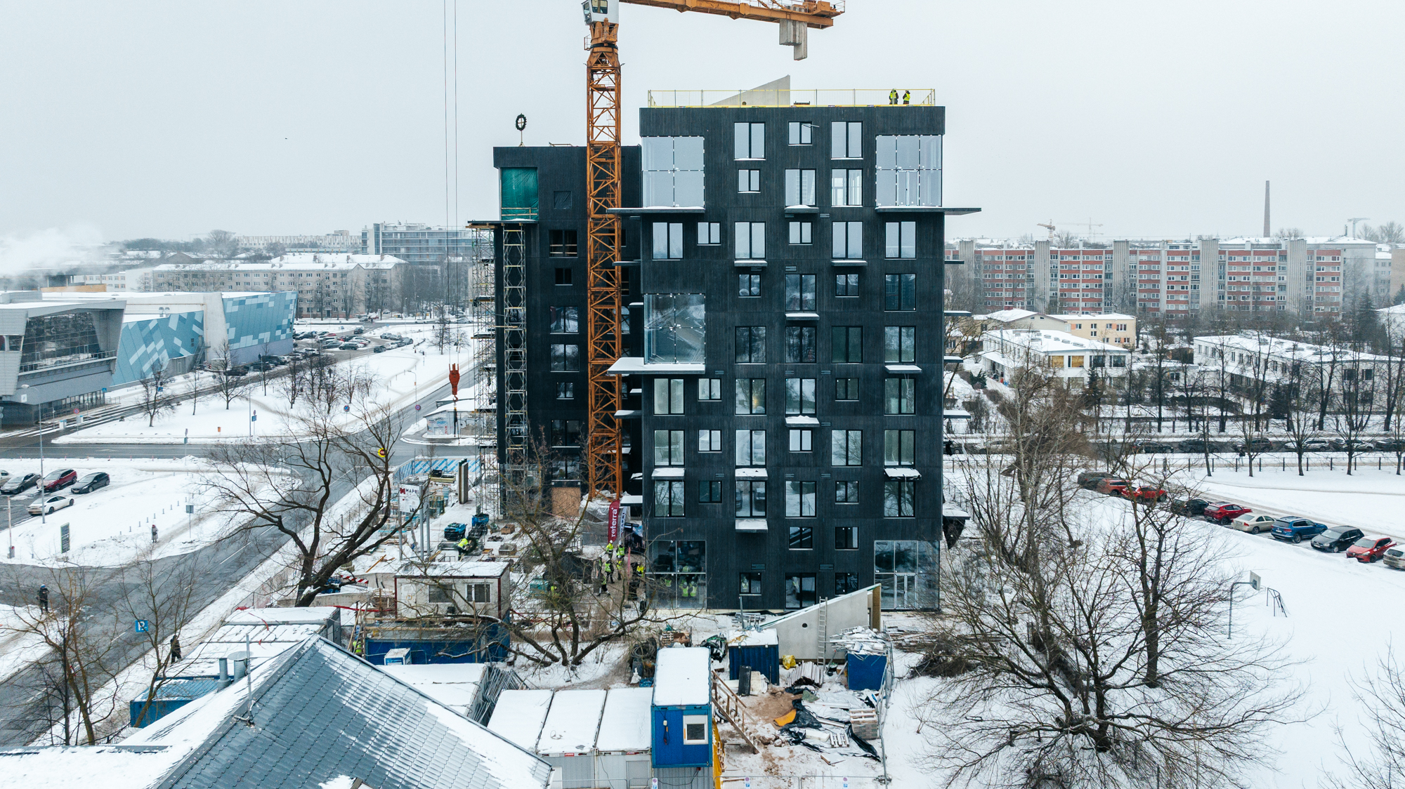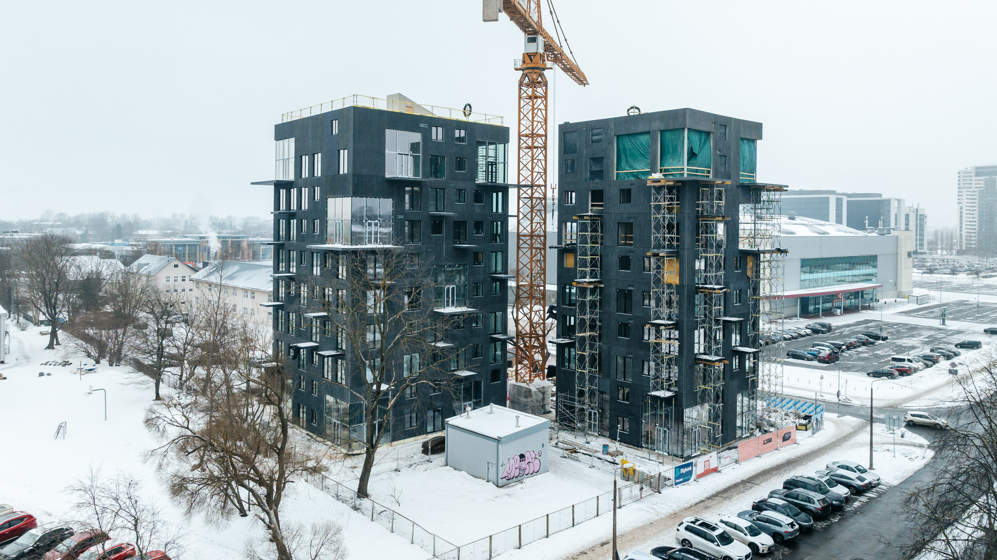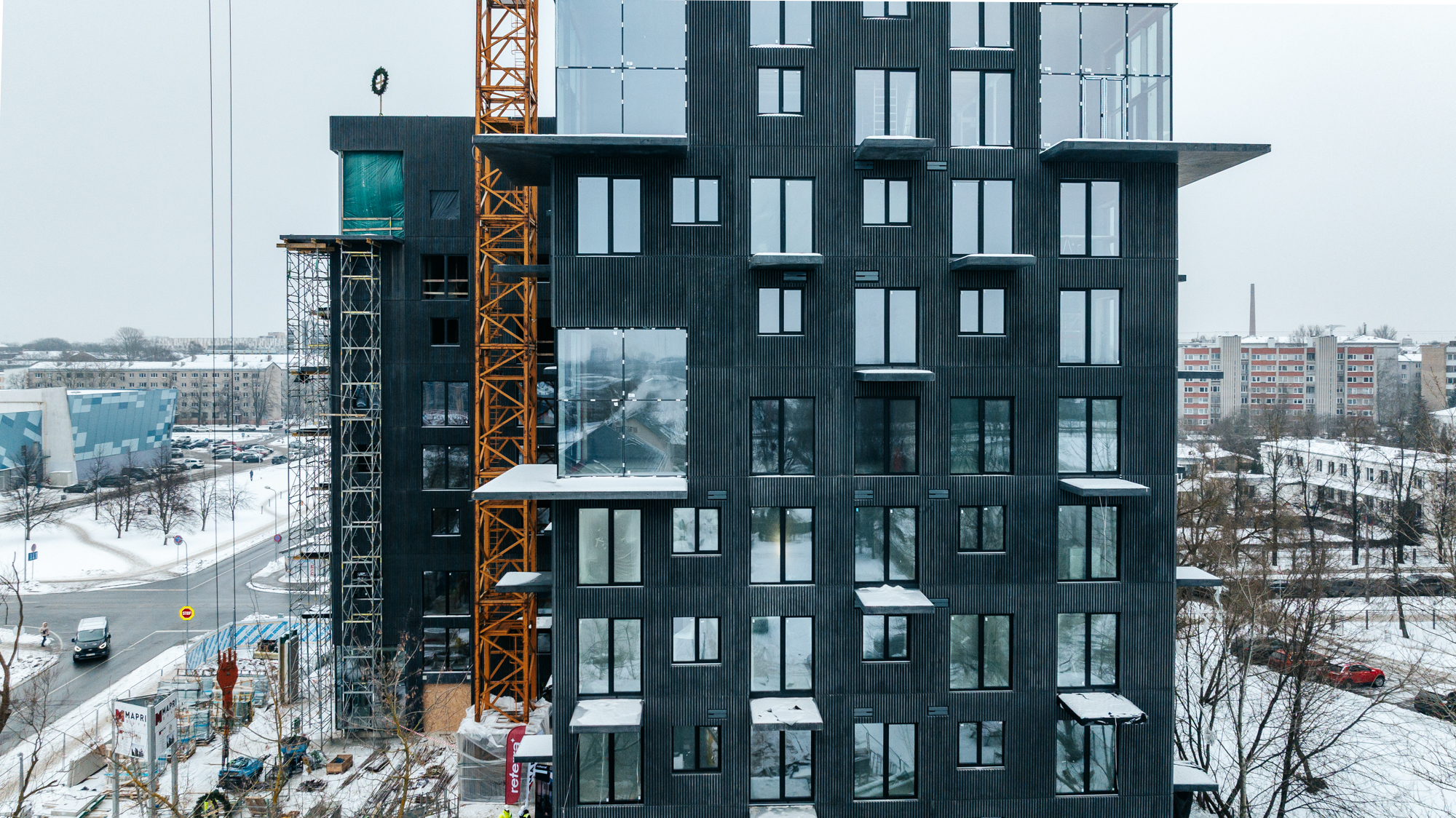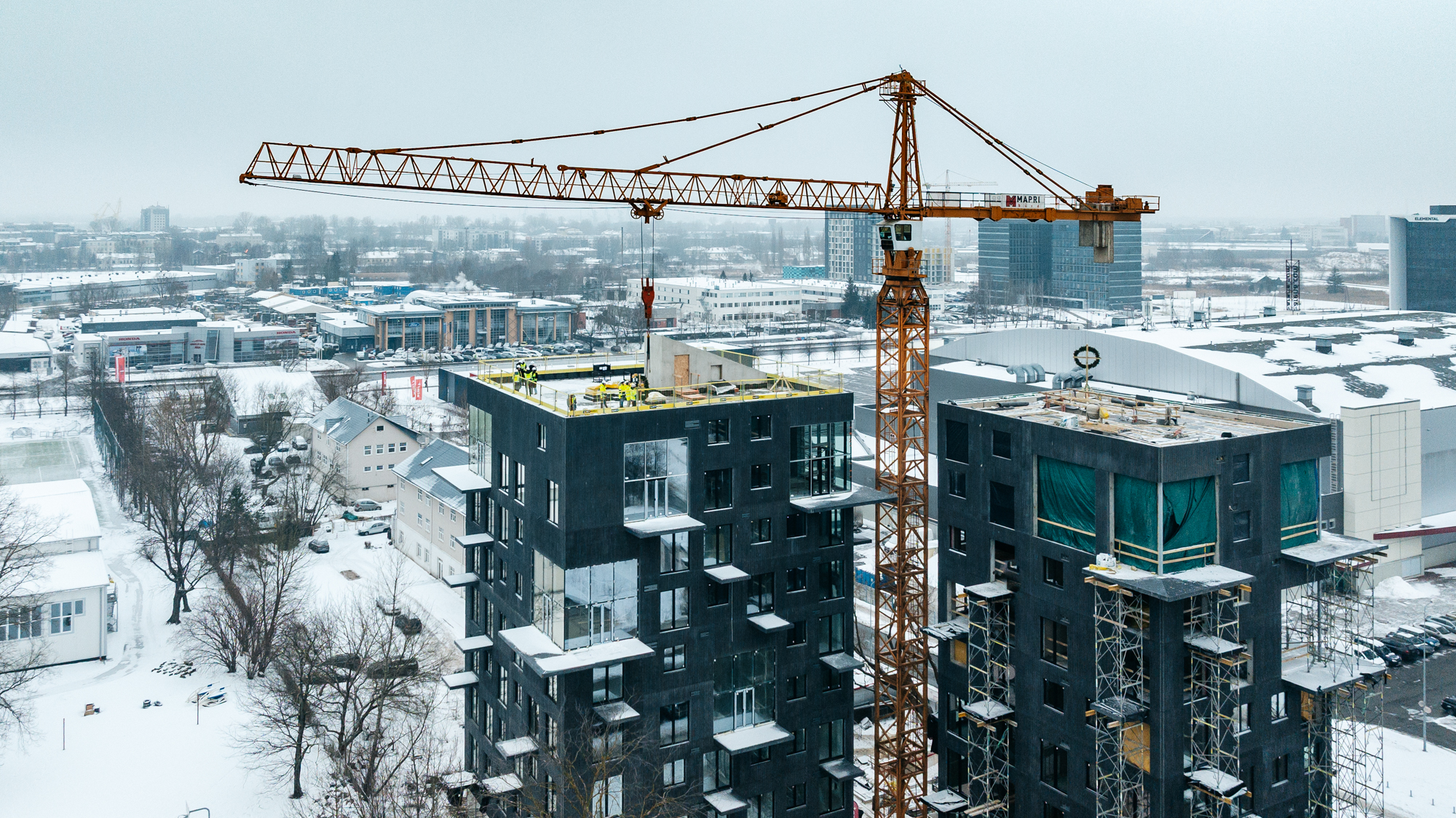 “Mapri Būve” projektu vadītājs Didzis Dumbris norāda, ka projektam izvirzītas augstas kvalitātes prasības, un pasūtītājs ar īpašu rūpību seko līdzi katrai detaļai – tieši detaļās slēpjas šī projekta izcilība. “Ēku fasādēs izmantoti melni, rievoti betona paneļi ar rūpnieciski betonā iestrādātu pigmentu. Tas ir Latvijā salīdzinoši netipisks risinājums, kas nodrošina ilgmūžību, noturību un neprasa pārkrāsošanu laika gaitā,” viņš skaidro un piebilst, ka līdz ar abu ēku augstākā būves punkta sasniegšanu lielākā daļa inženierkomunikāciju izbūves jau ir veikta.