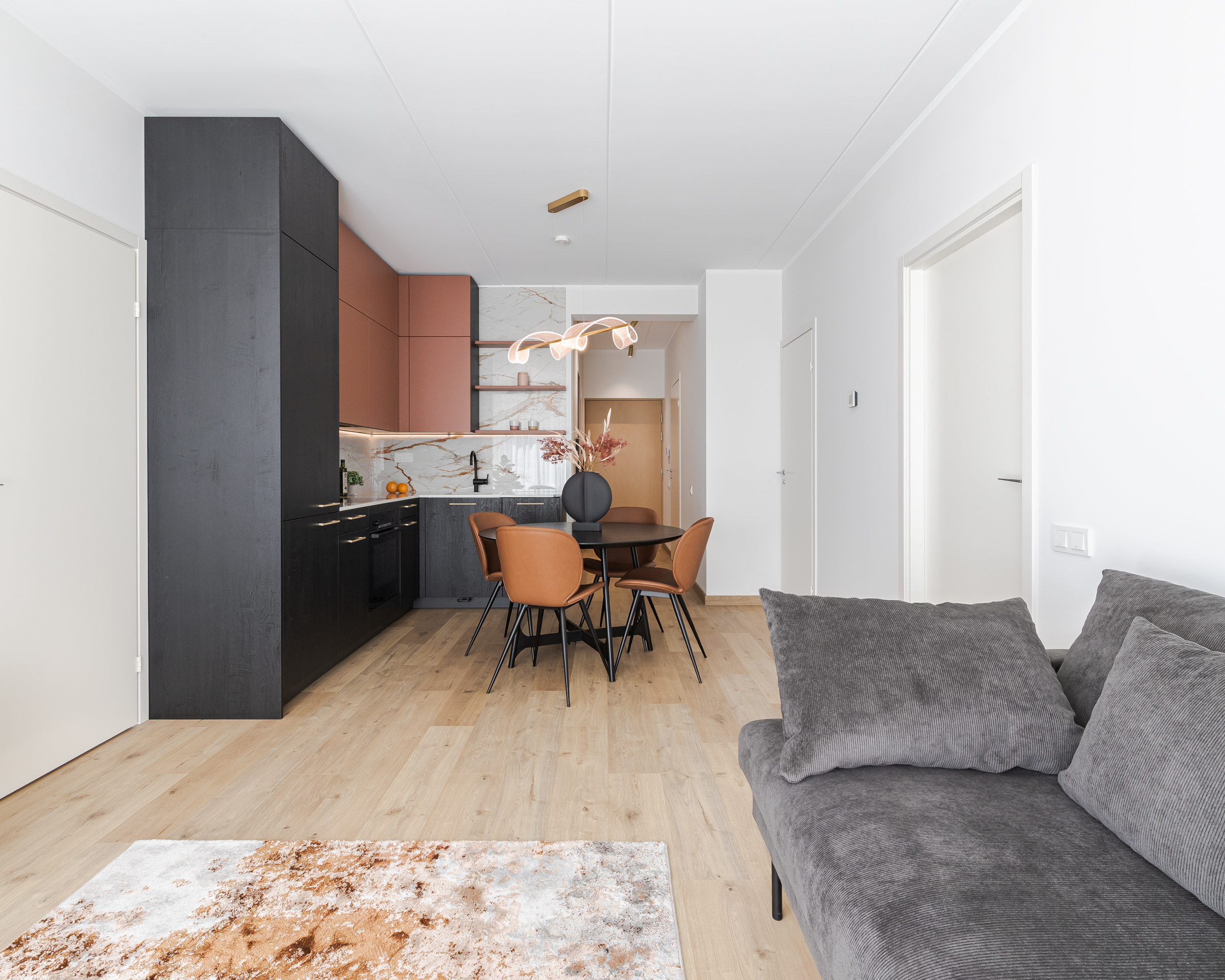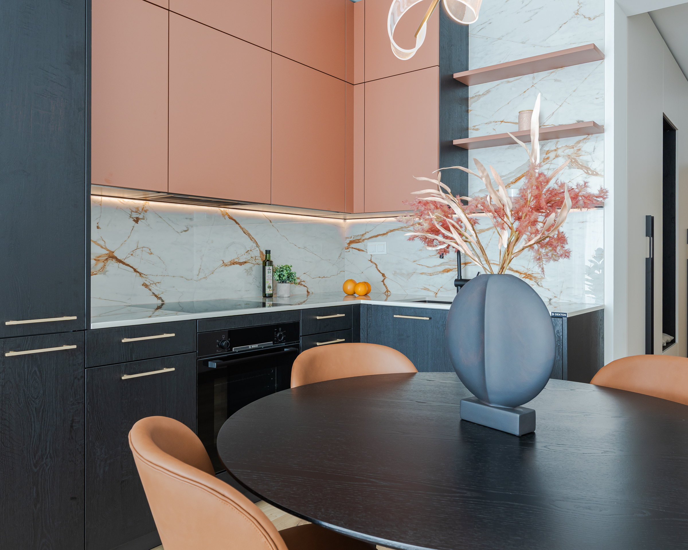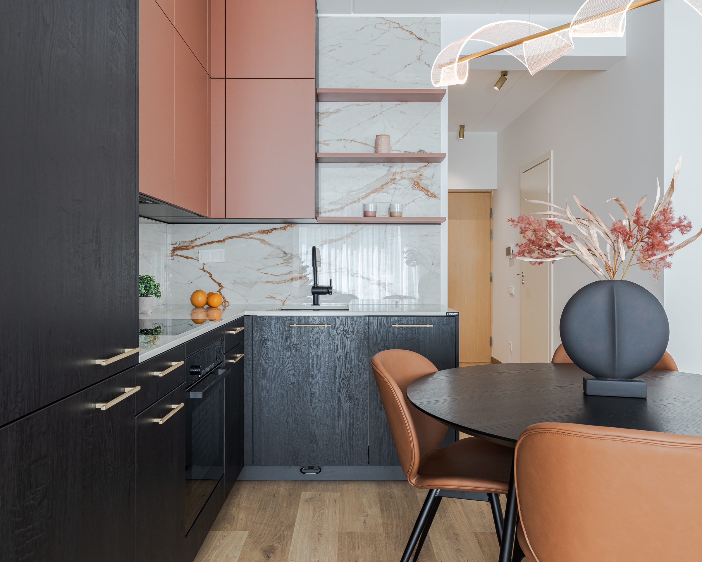 “Tā kā dzīvoklī ir gaišas sienas, grīdas un plaši logi, mēs nolēmām virtuvē izmantot drosmīgākus akcentus – tumši melnu koku un košu koraļļu toni, kas lieliski izceļas uz gaišā fona. Dekton ‘Awake’ virsma ar sulīgu terakotas un grafīta toņu kombināciju eleganti apvieno interjera krāsu paleti. Virtuves tehnika (Bosch, Elica) un santehnika (Grohe, Reginox) – viss izvēlēts melnā krāsā no mūsu uzticamajiem sadarbības partneriem. Savukārt guļamistabas un gaiteņa skapjos priekšplānā izvirzīti mierīgāki toņi ar dabīga koka akcentu. Rezultāts – elegants, aktuāls un funkcionāls interjers, kas pielāgots mūsdienīga cilvēka ikdienas vajadzībām un dzīves ritmam,” dizaina idejās dalās Natalija Pumpure.
