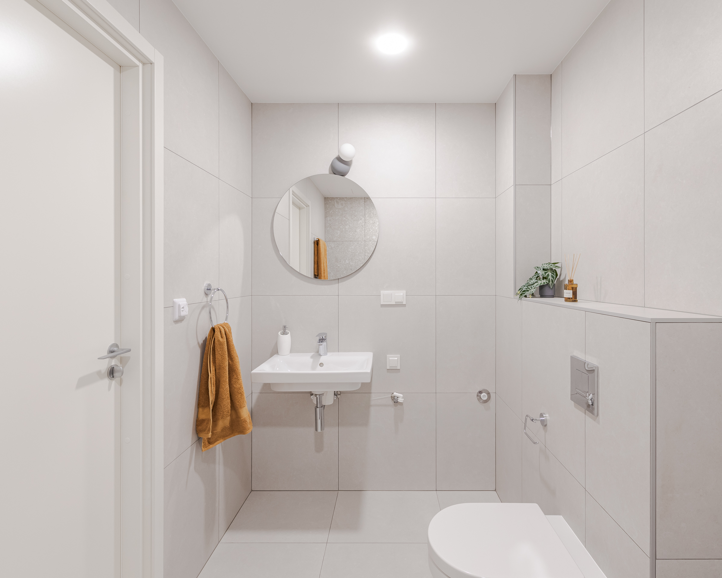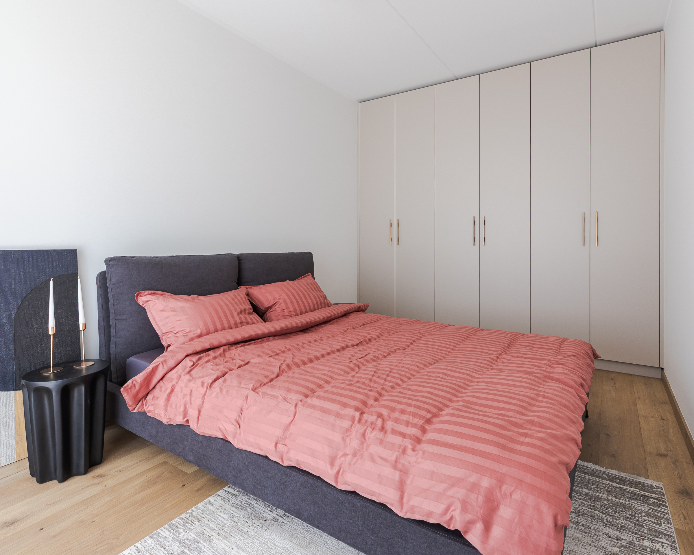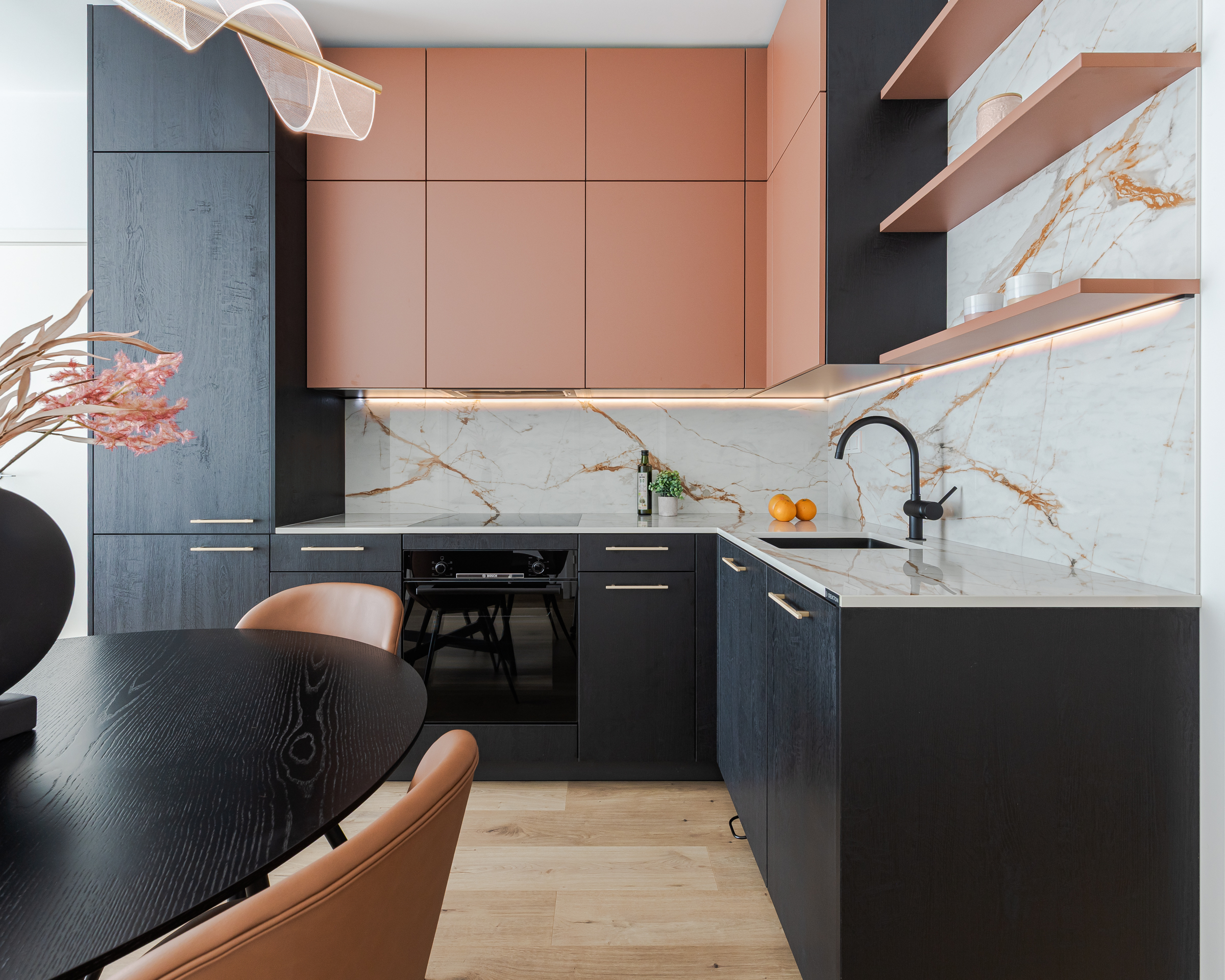“Tā kā dzīvoklī ir gaišas sienas, grīdas un plaši logi, mēs nolēmām virtuvē izmantot drosmīgākus akcentus – tumši melnu koku un košu koraļļu toni, kas lieliski izceļas uz gaišā fona. Dekton ‘Awake’ virsma ar sulīgu terakotas un grafīta toņu kombināciju eleganti apvieno interjera krāsu paleti. Virtuves tehnika (Bosch, Elica) un santehnika (Grohe, Reginox) – viss izvēlēts melnā krāsā no mūsu uzticamajiem sadarbības partneriem. Savukārt guļamistabas un gaiteņa skapjos priekšplānā izvirzīti mierīgāki toņi ar dabīga koka akcentu. Rezultāts – elegants, aktuāls un funkcionāls interjers, kas pielāgots mūsdienīga cilvēka ikdienas vajadzībām un dzīves ritmam,” dizaina idejās dalās Natalija Pumpure.